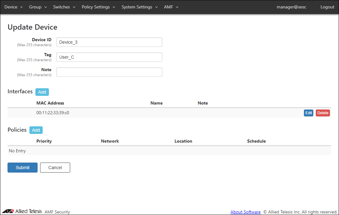 On the Add Device or the Update Device page, the MAC Address is automatically added to the "Interfaces" for the device. Enter additional data such as Device ID, Tag, Note, security policies and other interfaces as required, then click "Submit".