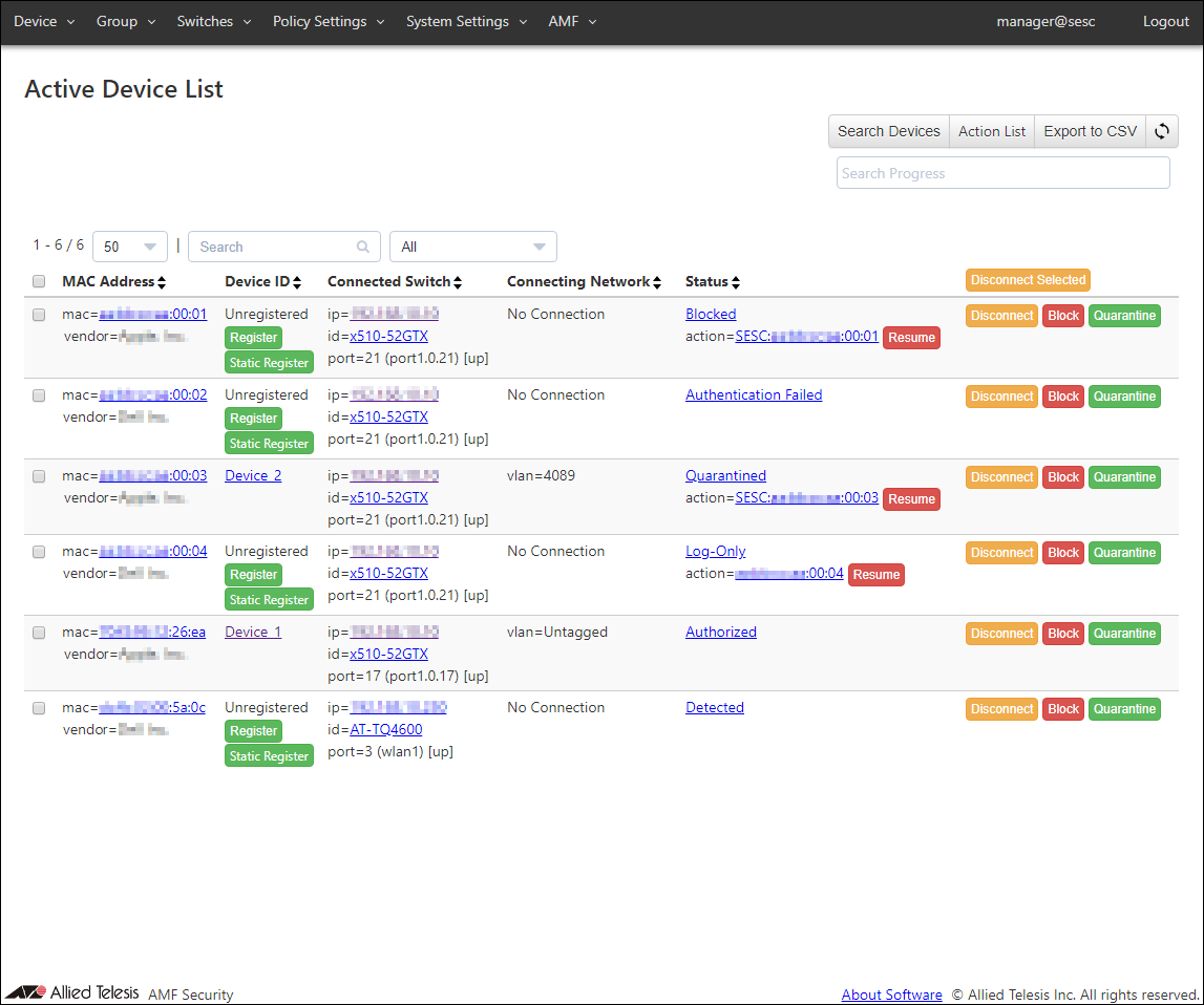 ・Blocked: a device which is blocked at layer 2 (MAC) level by AMF Application Proxy. ID of the action which is performing the block operation is shown in the form of "action=Action ID" with the "Delete" button beside it. The device cannot access the network unless the action is deleted by the "Delete" button on this page or the Policy Settings > Action List page.