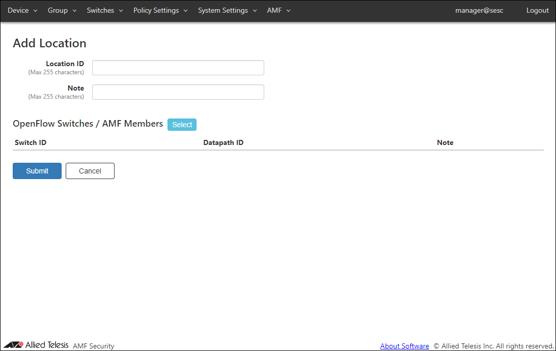 | Submit | Add the checked OpenFlow Switches or AMF Members to the location. |