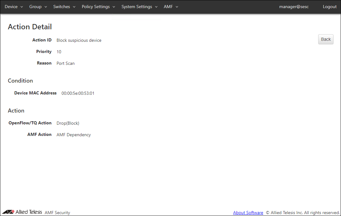 NoteTo unblock an AMF Security-reported suspected device in an AMF Application Proxy environment, use this page to delete a corresponding action. Refer to Quick Tour / What is AMF Security > What is AMF Application Proxy for more details on AMF Application Proxy.