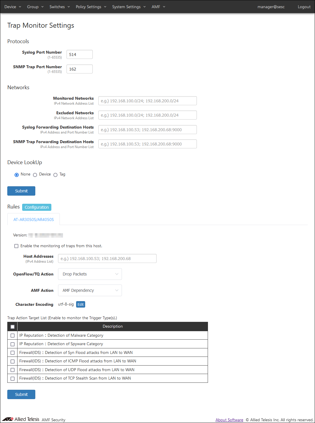 AMF Security also sends emails to forward the contents of syslog messages and SNMP traps it receives.