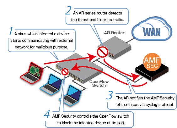 Advanced VPN Access Router AT-AR3050S/AT-AR4050S series (AR Router) is the next generation firewall router with the rich set of security features such as firewall, IPS/IDS and IP reputation in addition to the VPN router functions. AMF Security can use the threat information provided by the AR Router to control the OpenFlow Switches so that it can dynamically manage and operate client devices connected to the switches.
