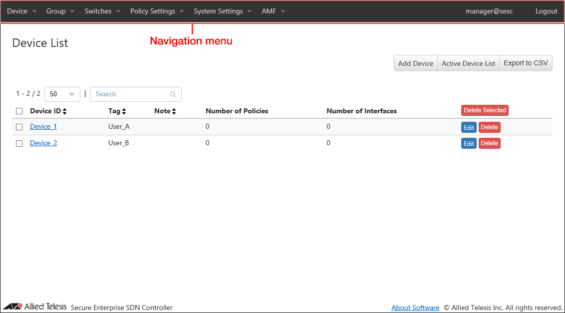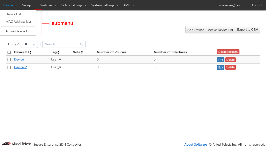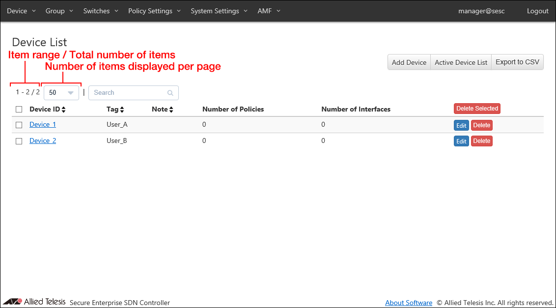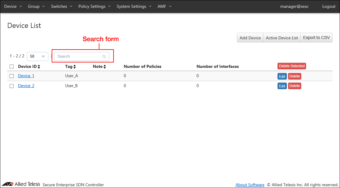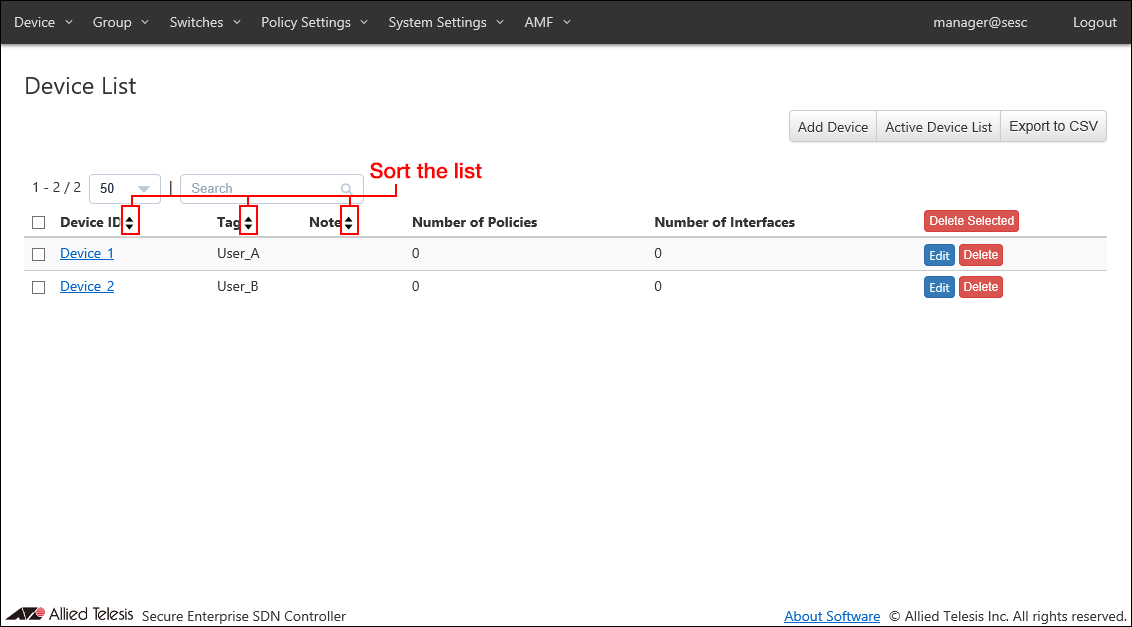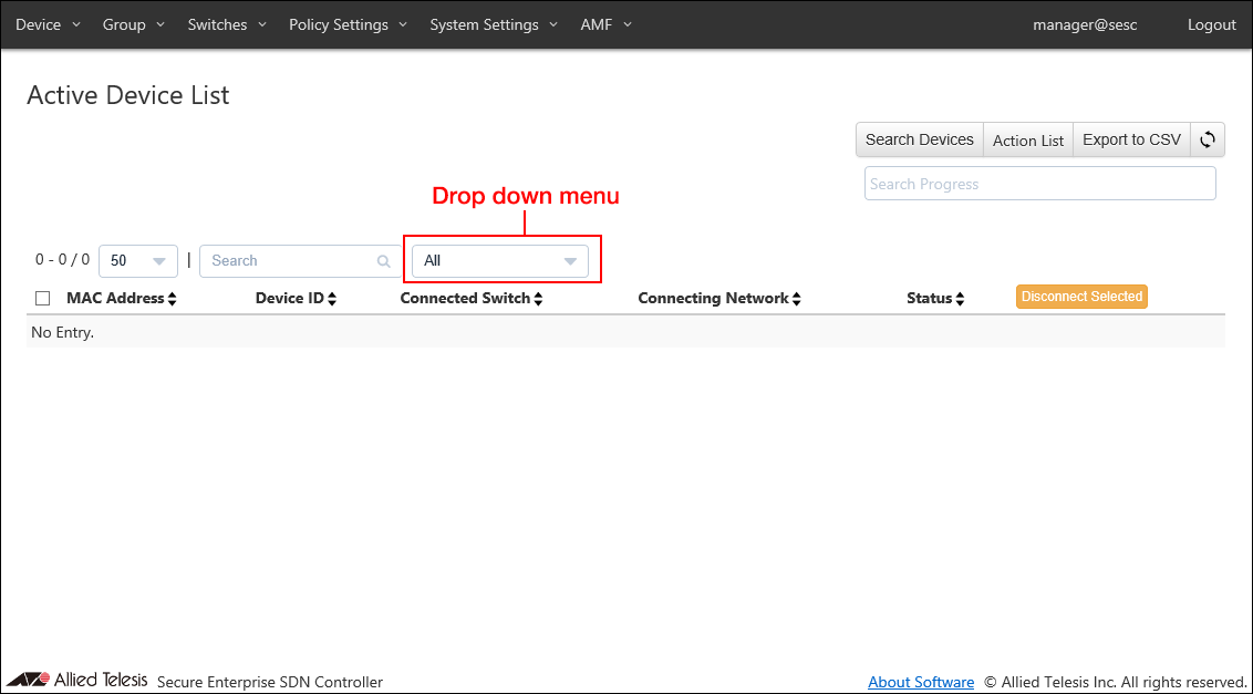 - On the Device > Active Device List page and the Switches > Active OpenFlow Switch List page, you can filter items by the status of Devices or OpenFlow Switches using dropdown menu.