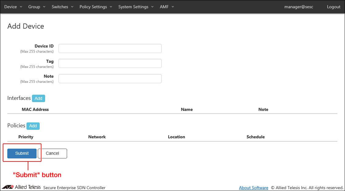 There is the "Submit" button on each configuration page or dialog. After changing configurations on a page or a dialog, do not forget to click the "Submit" button before moving to another page.When you click the "Submit" button, the changes you made on the page are immediately applied to the AT-SESC's operation.