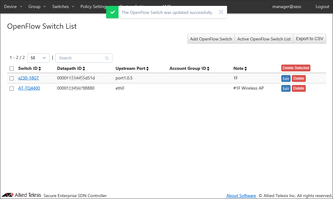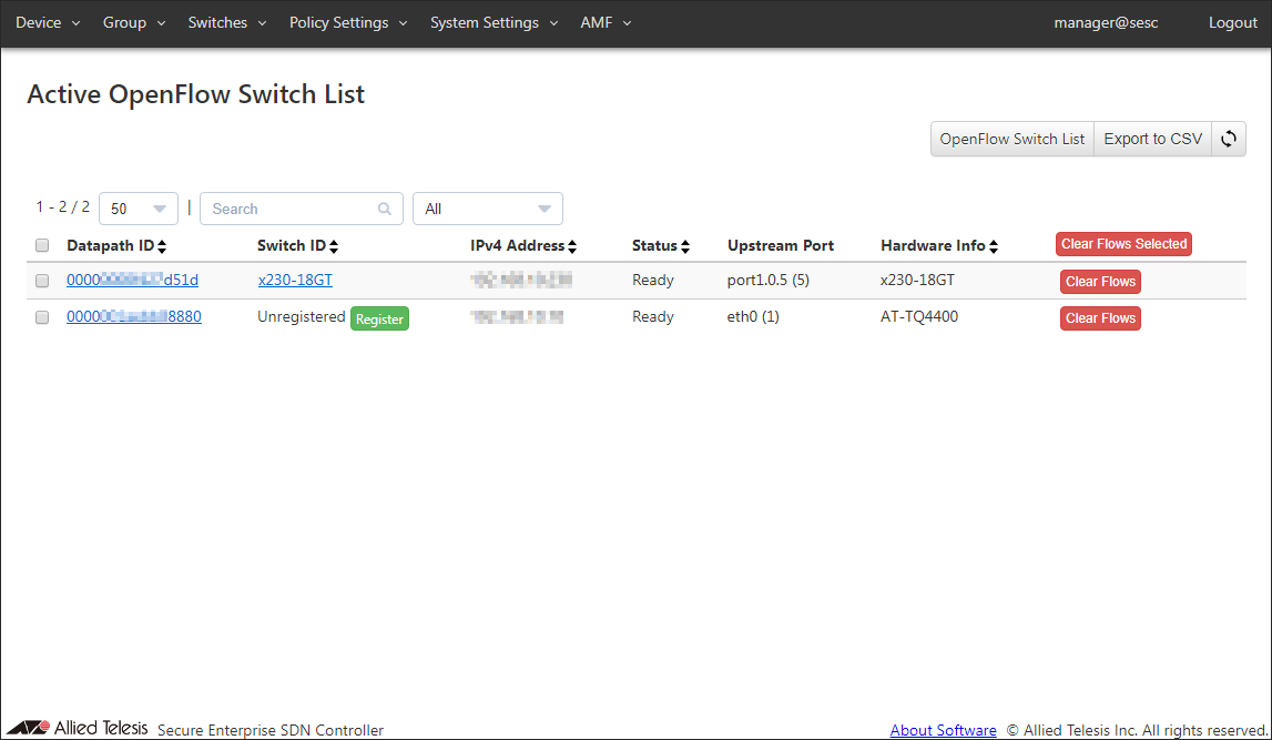 Let's register an AT-TQ4400 as an OpenFlow Switch.- Open the Switches > Active OpenFlow Switch List page.