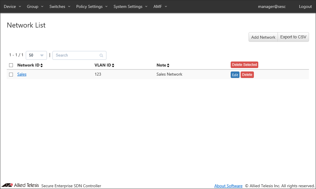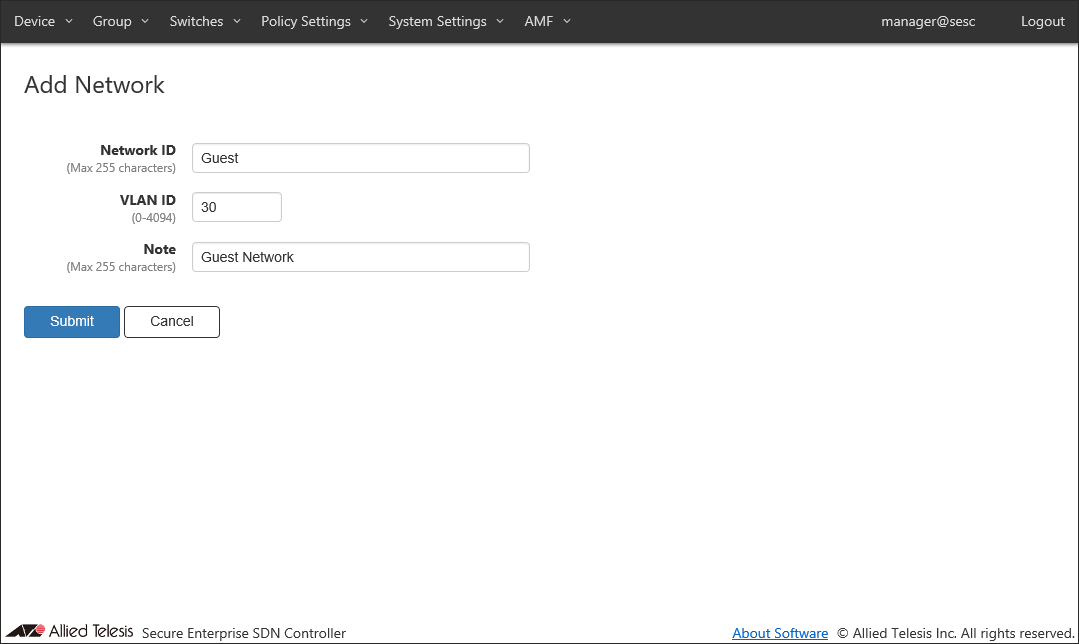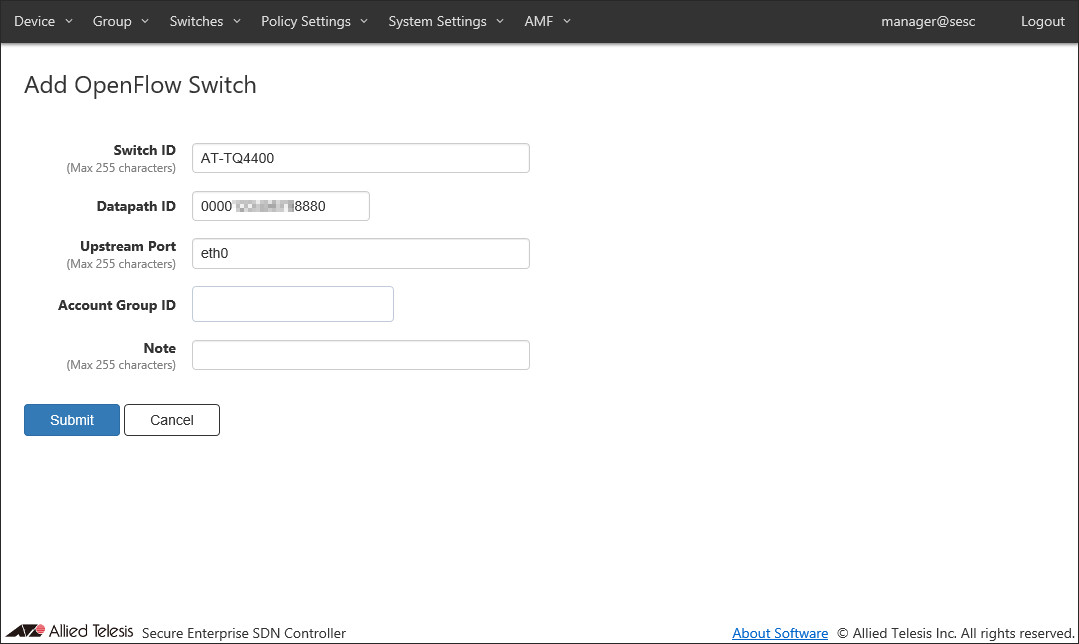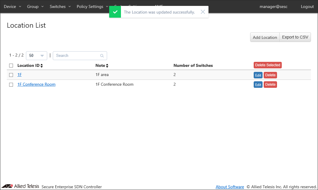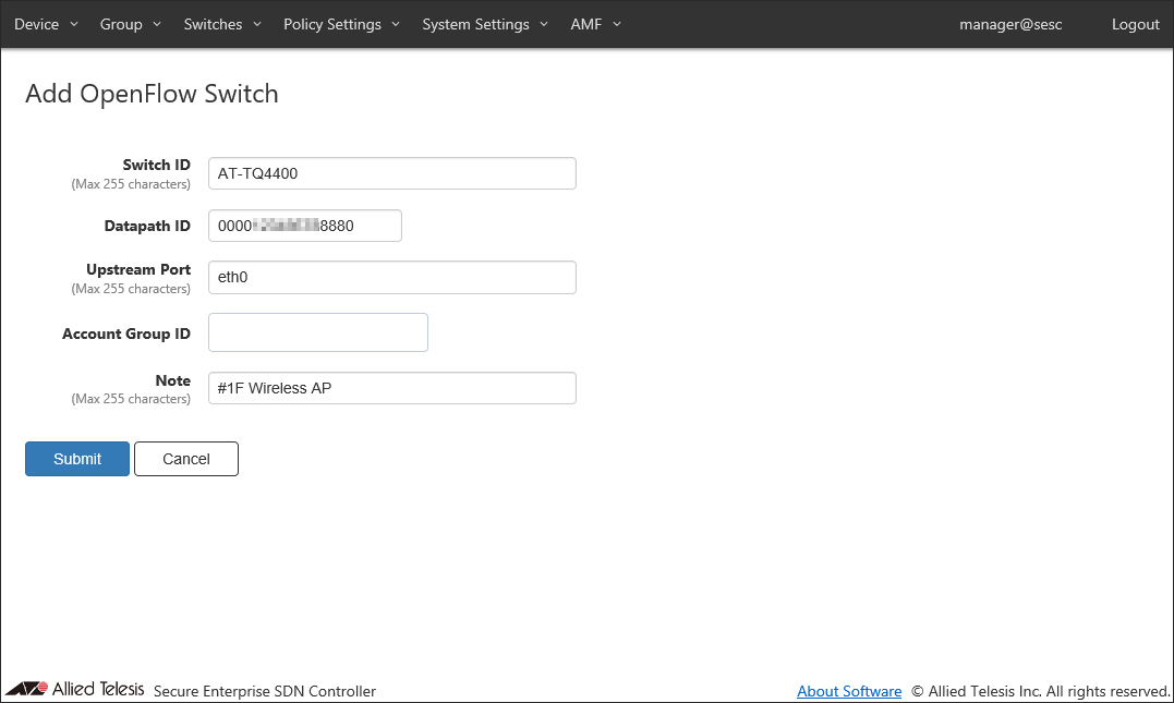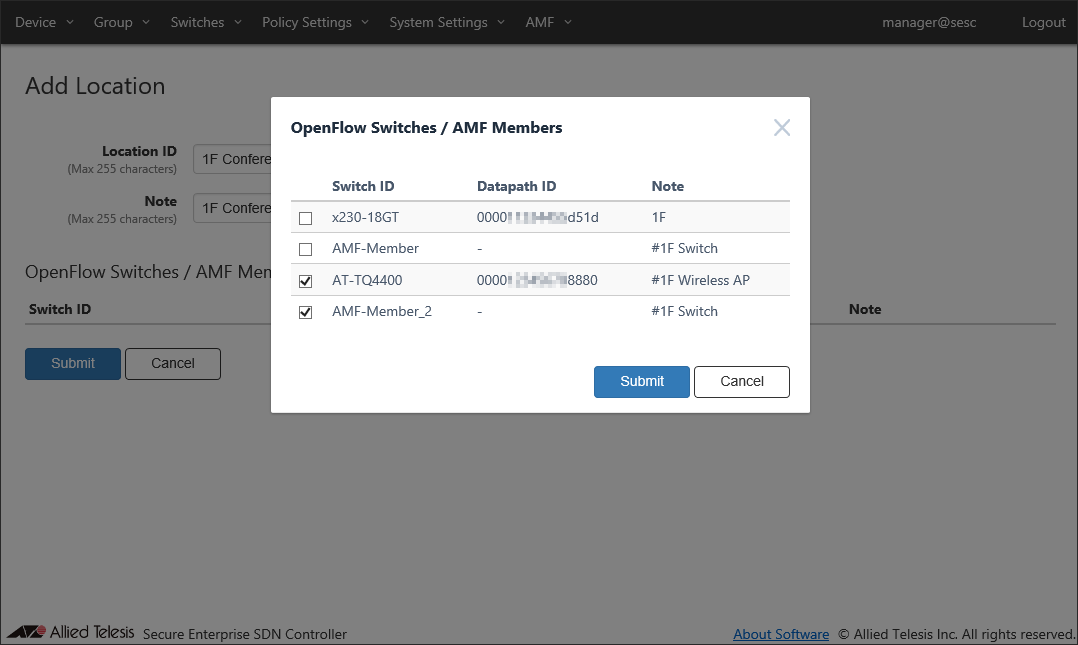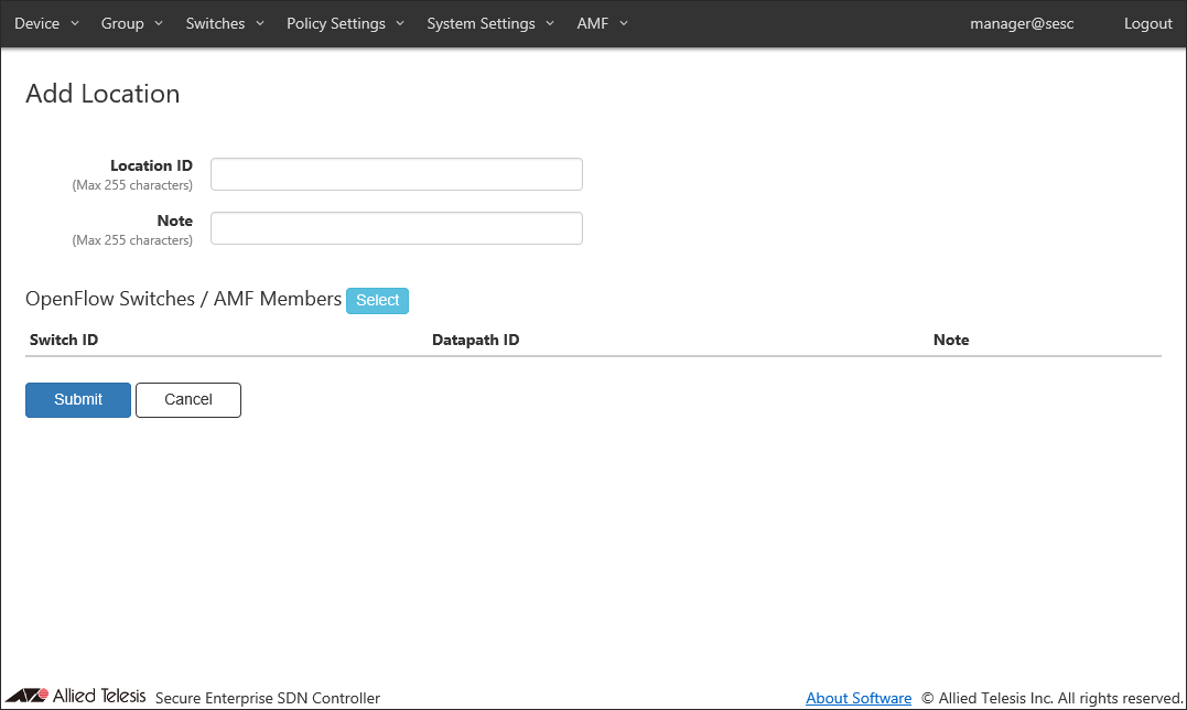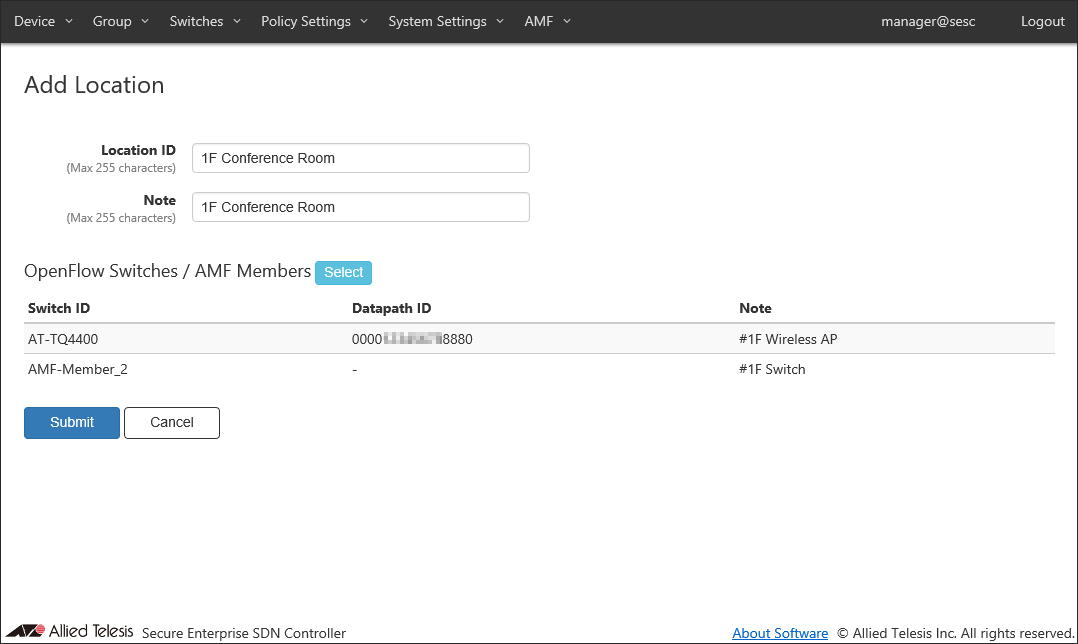 Add a new location where the OpenFlow Switch and the AMF Member are installed.Location can be added on the Policy Settings > Add Location page.