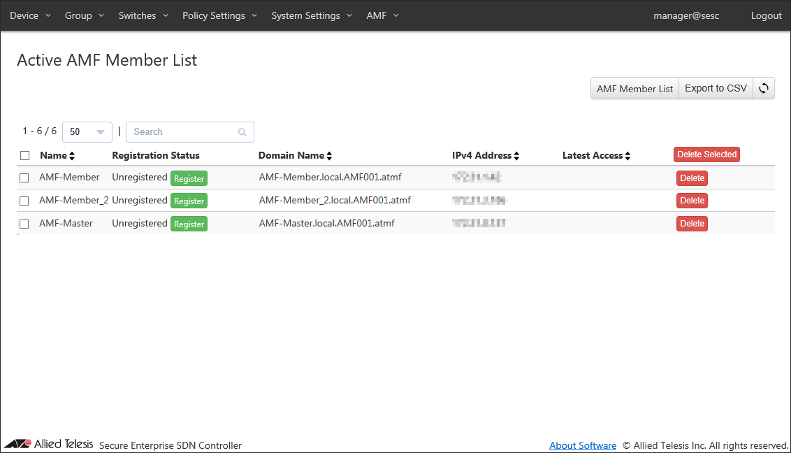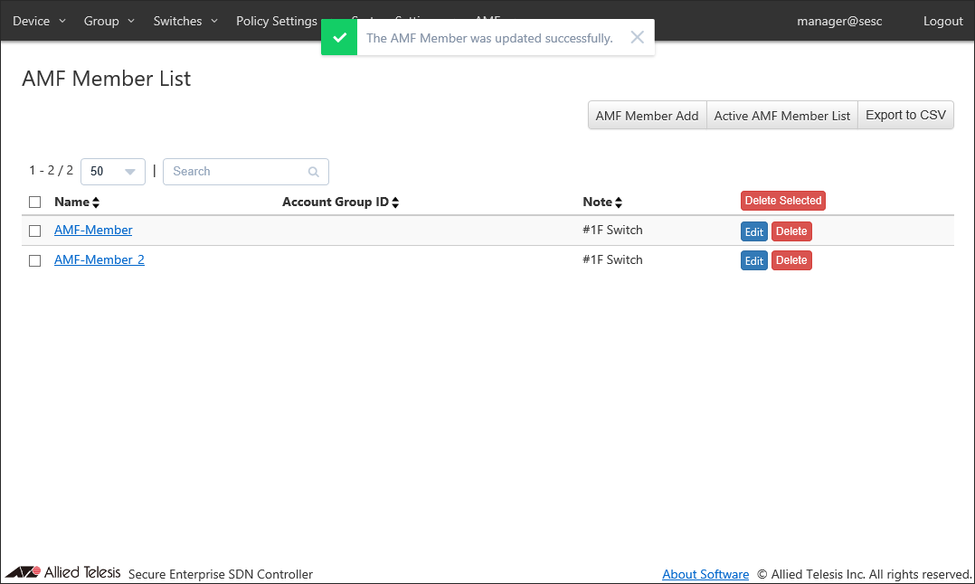 Register a host with the hostname "AMF-Member_2" as an AMF Member.- Open the Switches > Active AMF Member List page.