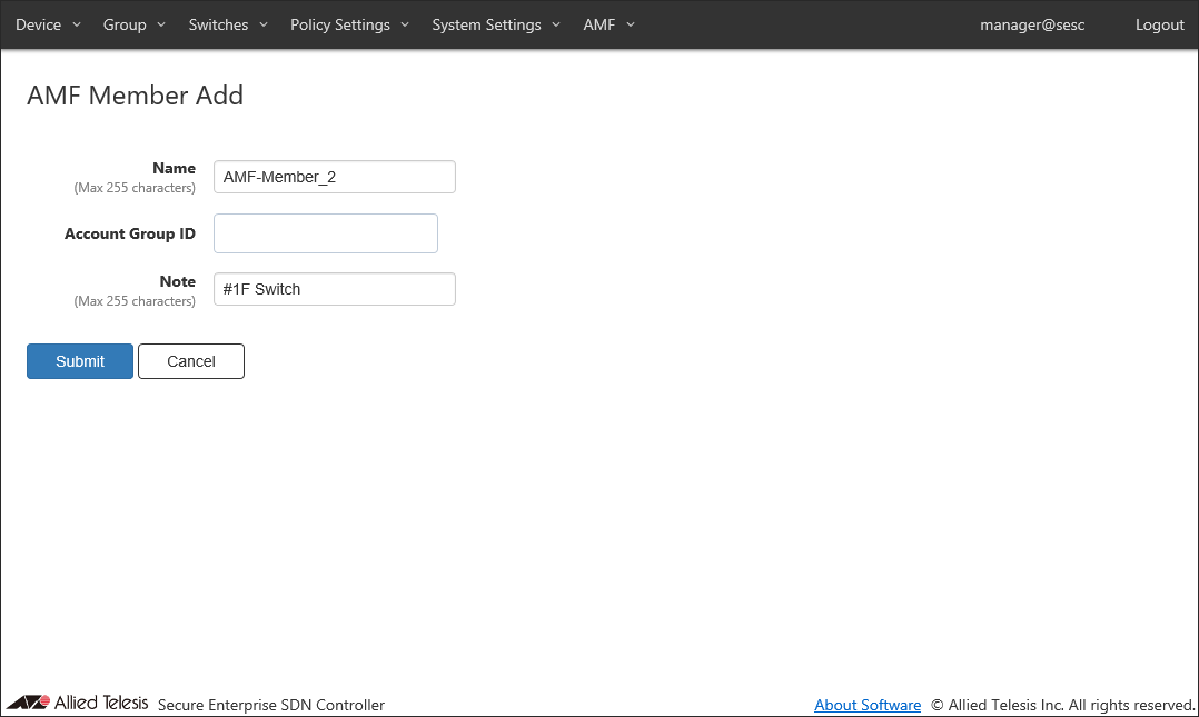 Max 255 characters. Can use alphanumeric, hyphen (-) and underscore (_).Account Group ID (None) Select Account Group ID to which AMF Member belongs. Note #1F Switch Arbitrary string (comment) for the AMF Member.
