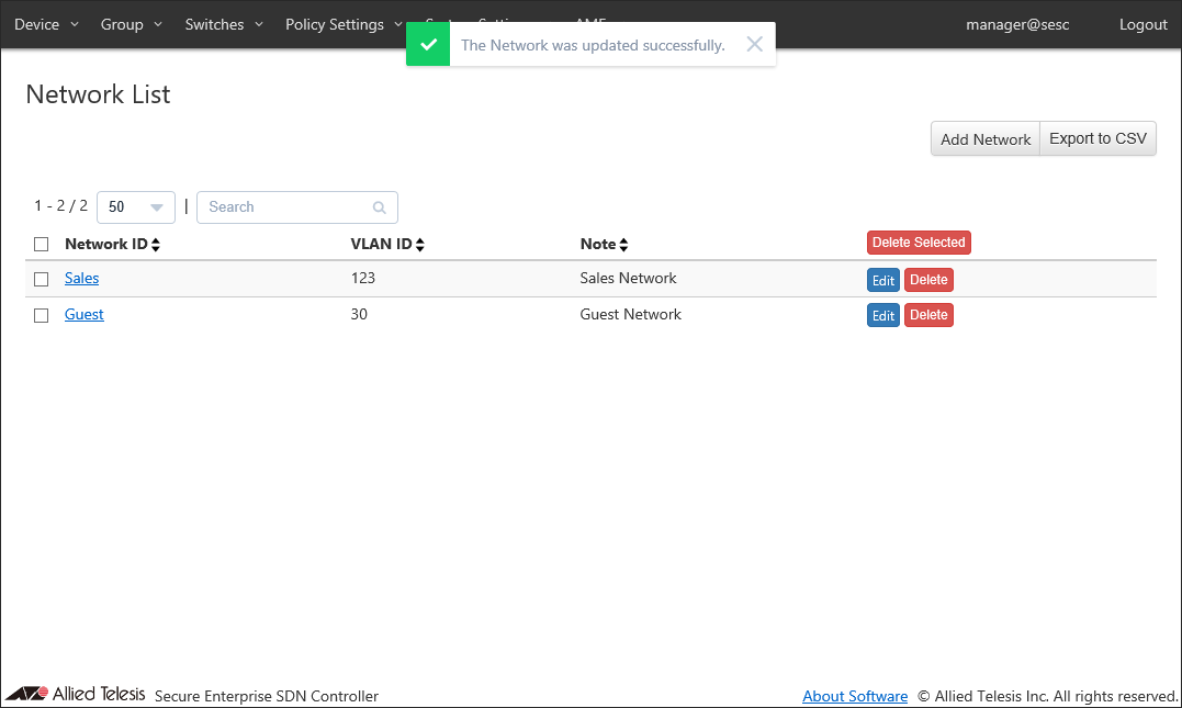 Later you can use the network to specify which VLAN a device can belong to. AT-SESC achieves this by telling switches to add appropriate VLAN tags to the packet originating from the allowed devices.