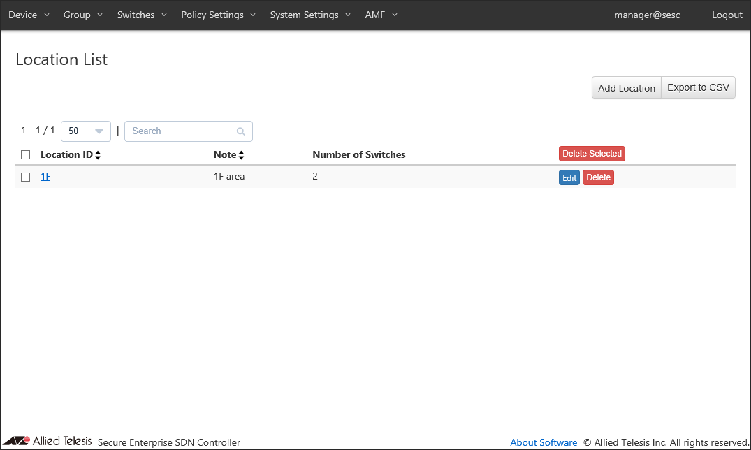 This page lists registered locations in AT-SESC. At this point, only location "1F" is registered.