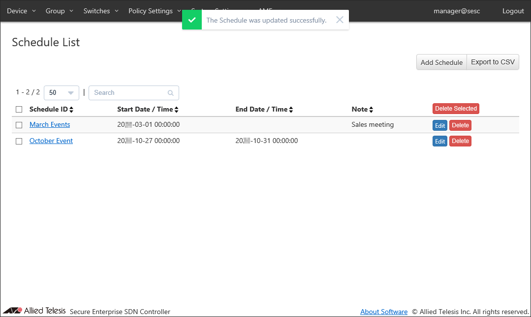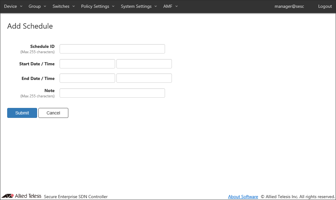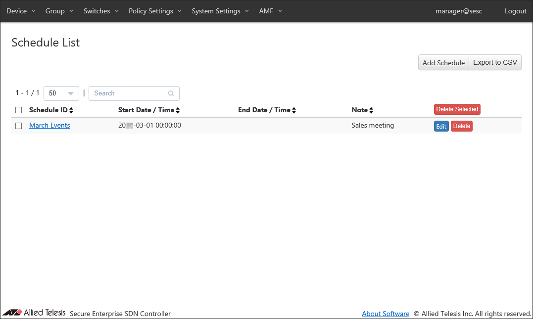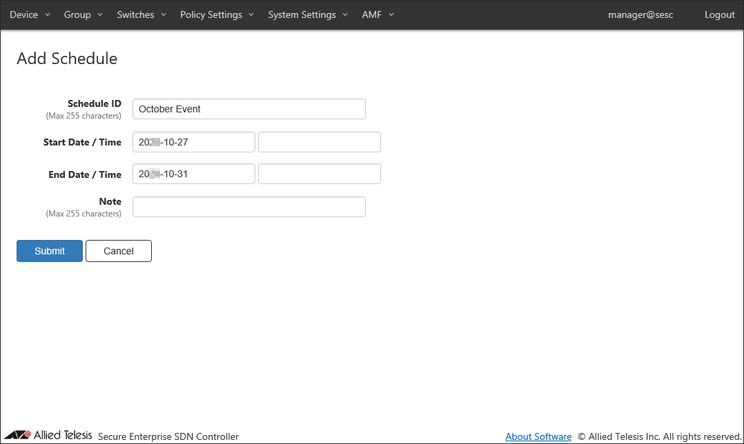 By adding schedules, you can control when a device can connect to the network. If one of the Starting or End Date / Time is not specified in a schedule, AT-SESC treats it as if it has no time limitation.