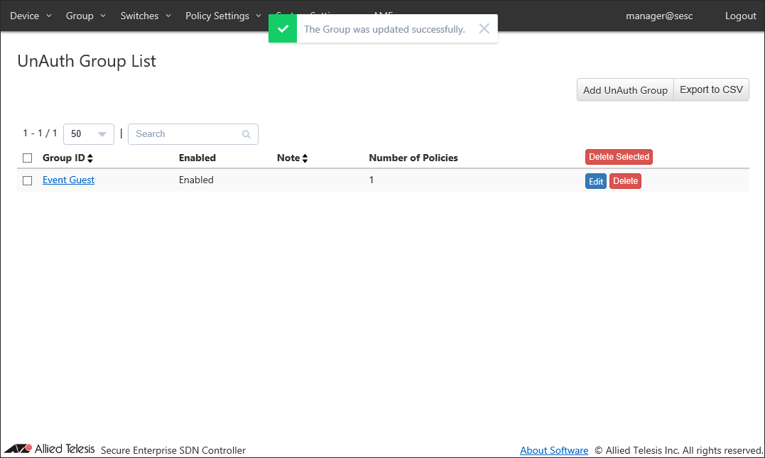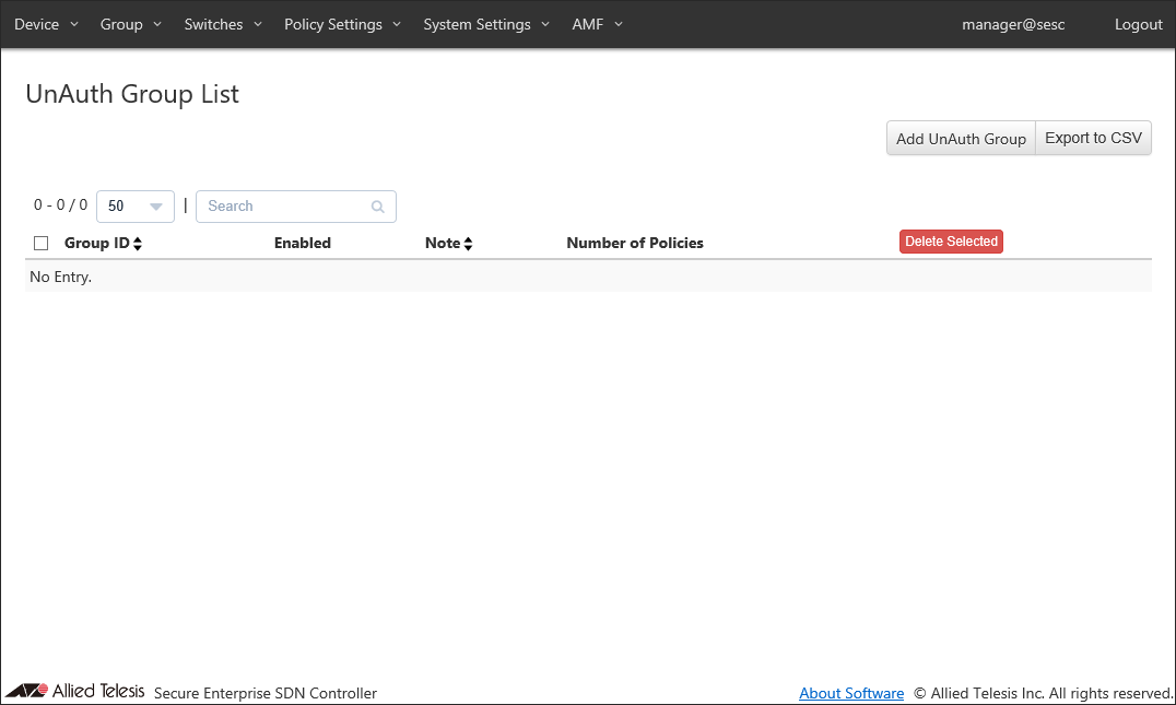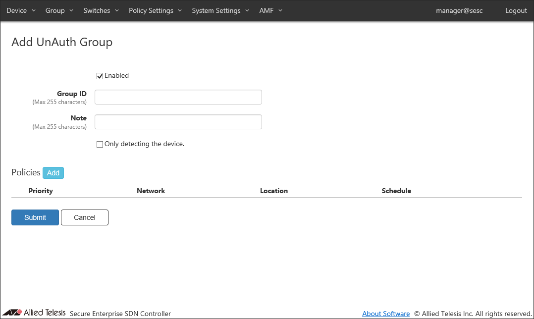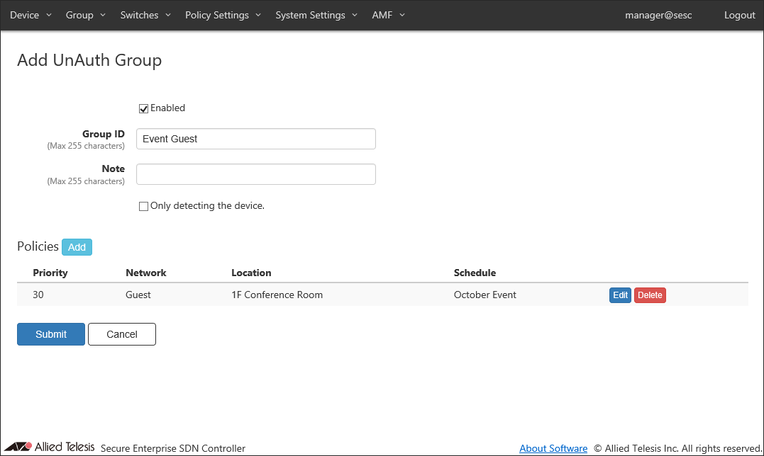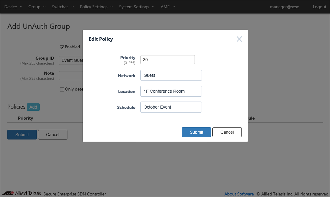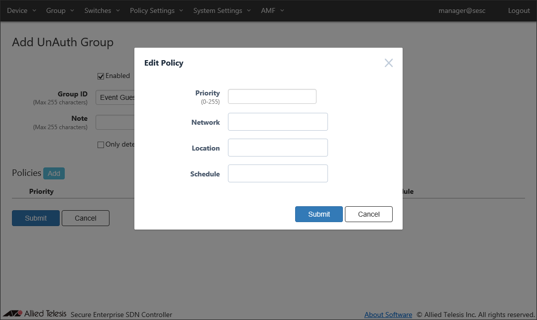 - If you specify Location, the UnAuth Group can access the network only from OpenFlow Switches and AMF Members in the location. If you do not specify Location, the UnAuth Group can access the network from all OpenFlow Switches and AMF Members.