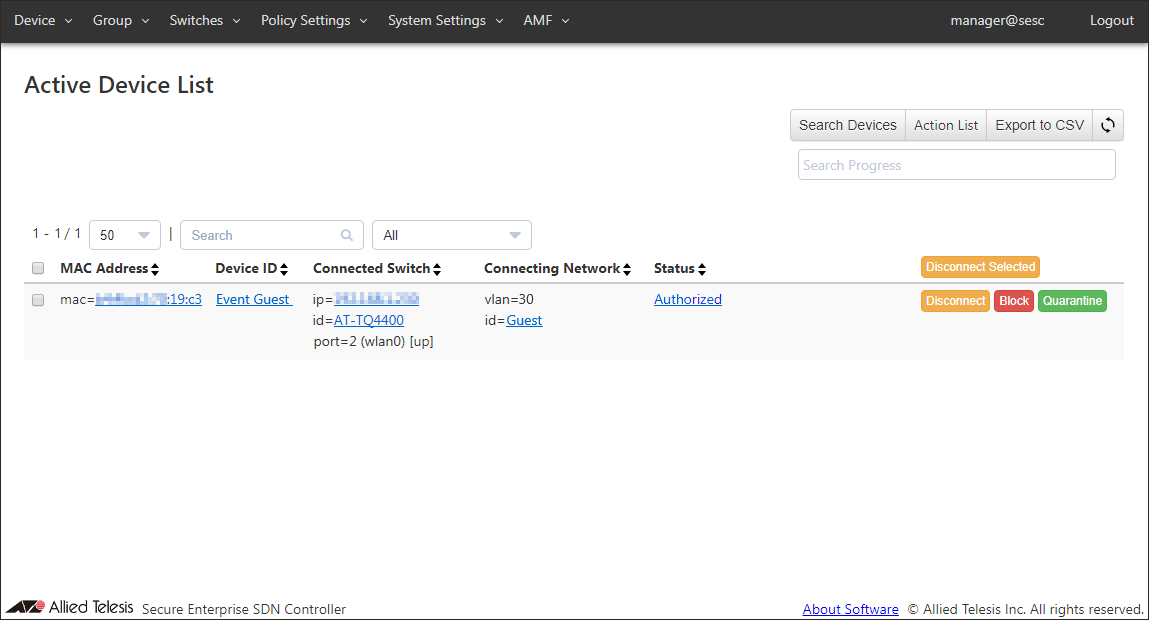 This page shows you the MAC addresses of the devices which are connecting to the OpenFlow Switches or AMF Members registered in AT-SESC's database.