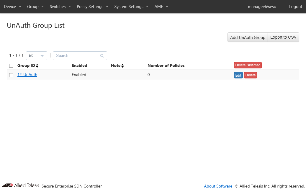| Export to CSV | Start downloading of a list of the UnAuth Group in CSV format. |