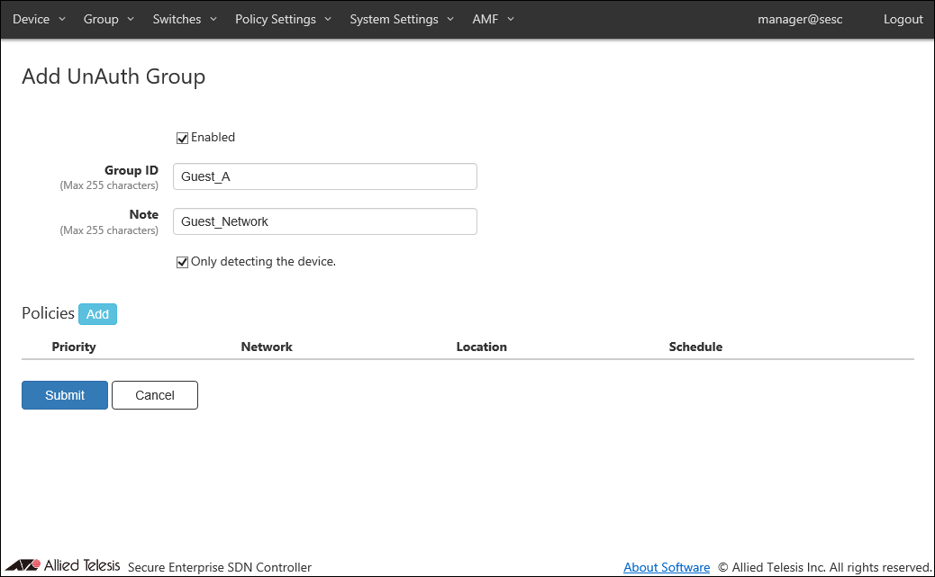 - If you specify Location, the UnAuth Group can access the network only from OpenFlow Switches and AMF Members in the location. If you do not specify Location, the UnAuth Group can access the network from all OpenFlow Switches and AMF Members.