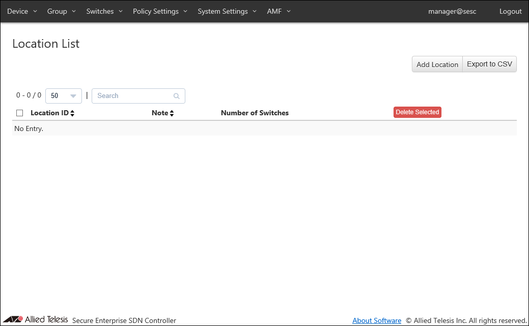 This page lets you add a new Location and associate OpenFlow Switches and AMF Members with the location.If you specify an added Location for a device, the device can access the network only from the OpenFlow Switches and AMF Members associated with the location.