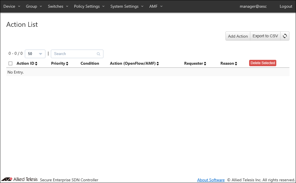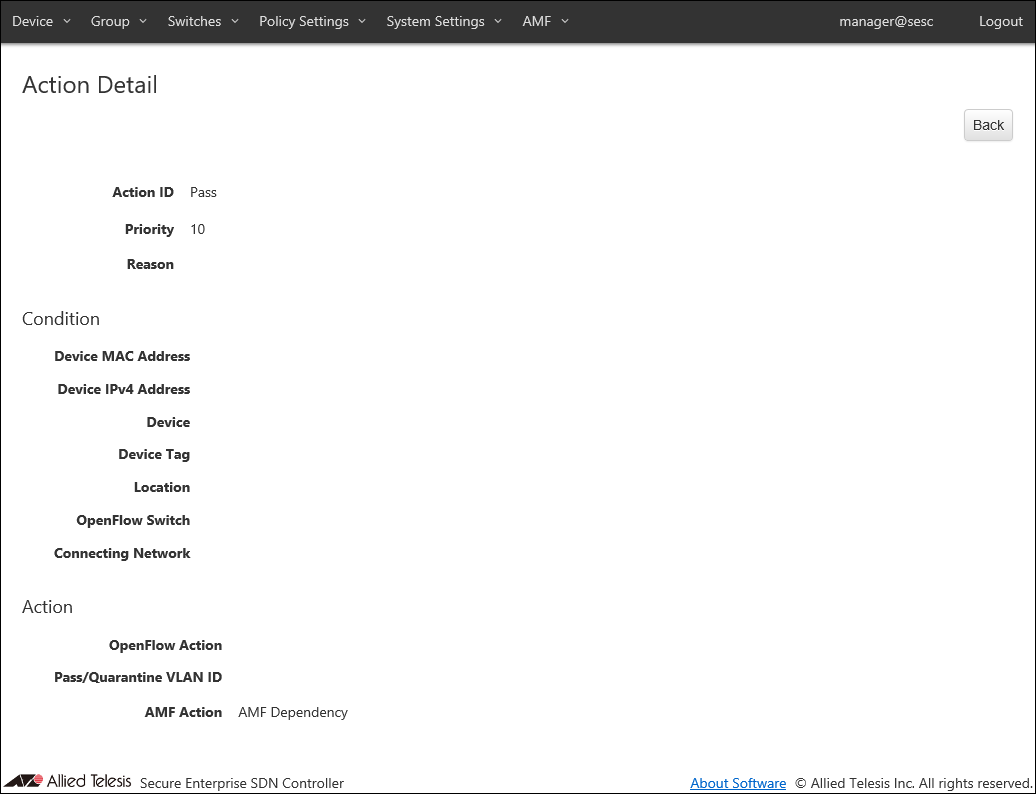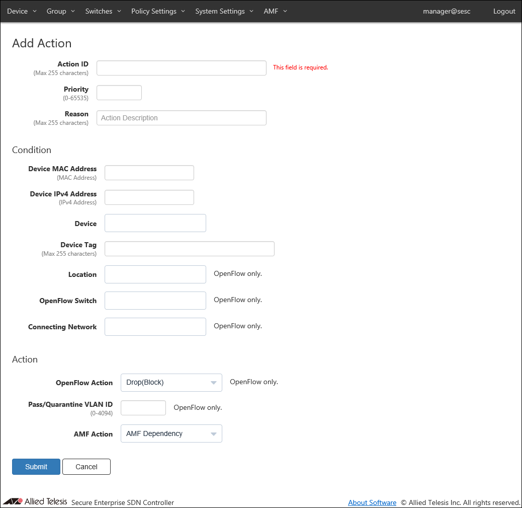 | Action (OpenFlow/AMF) | Action OpenFlow Action (Pass(Permit), Quarantine, Drop(Block) and Log-Only) and AMF Action (Quarantine, Drop Packets, Link-Down and IP-Filter) are displayed. |