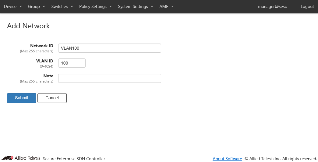 Enter a Network ID and a VLAN ID, then click "Submit".