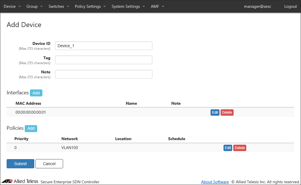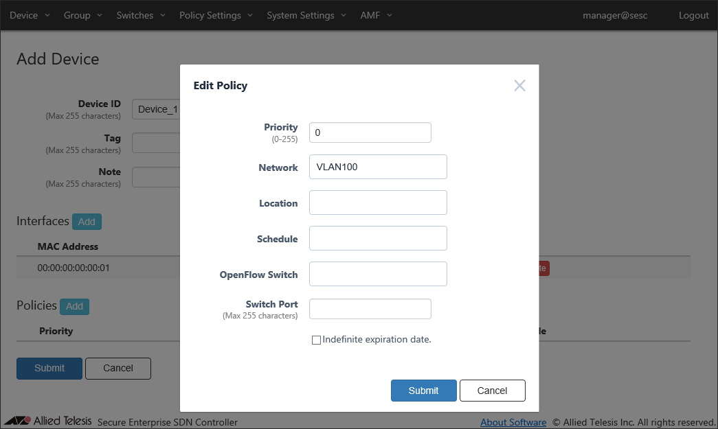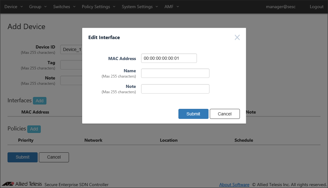 Click "Add" in "Policies" section to specify a network to assign to the device.