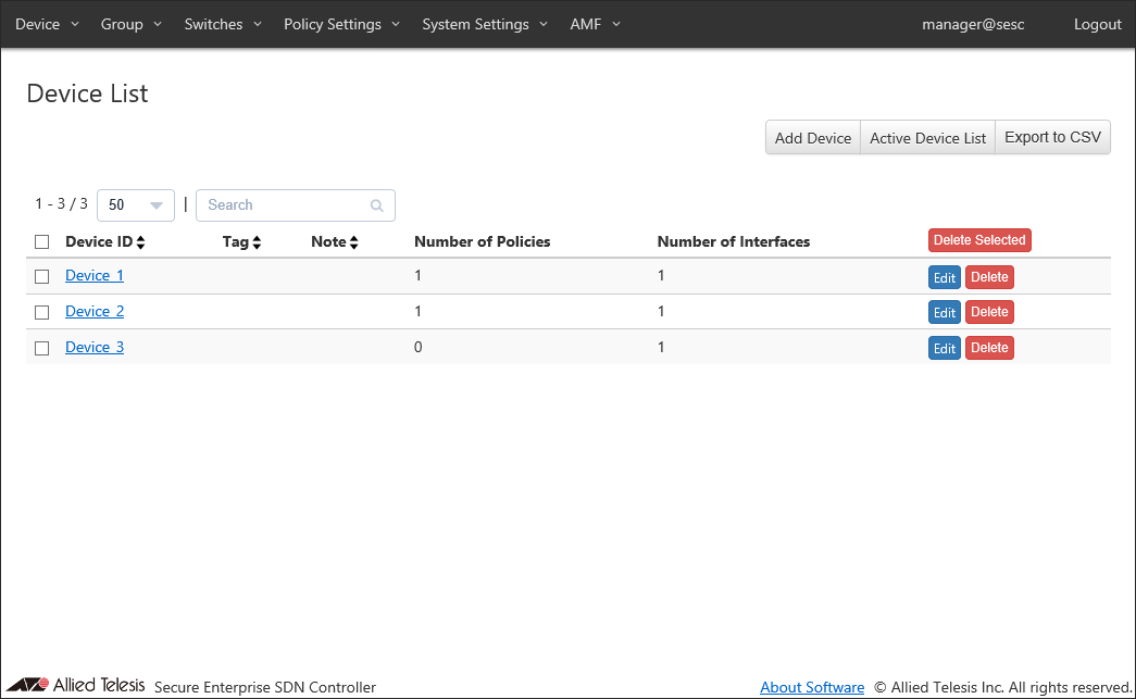 Once the connection between AT-SESC and the OpenFlow Switch is established, connected OpenFlow Switches are displayed on the Switches > Active OpenFlow Switch List page.