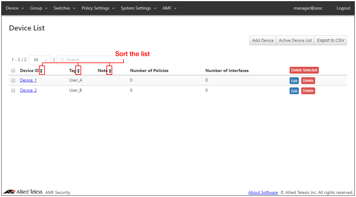 On the Device > Active Device List page and the Switches > Active OpenFlow Switch List page, you can filter items by the status of Devices or OpenFlow Switches using dropdown menu.