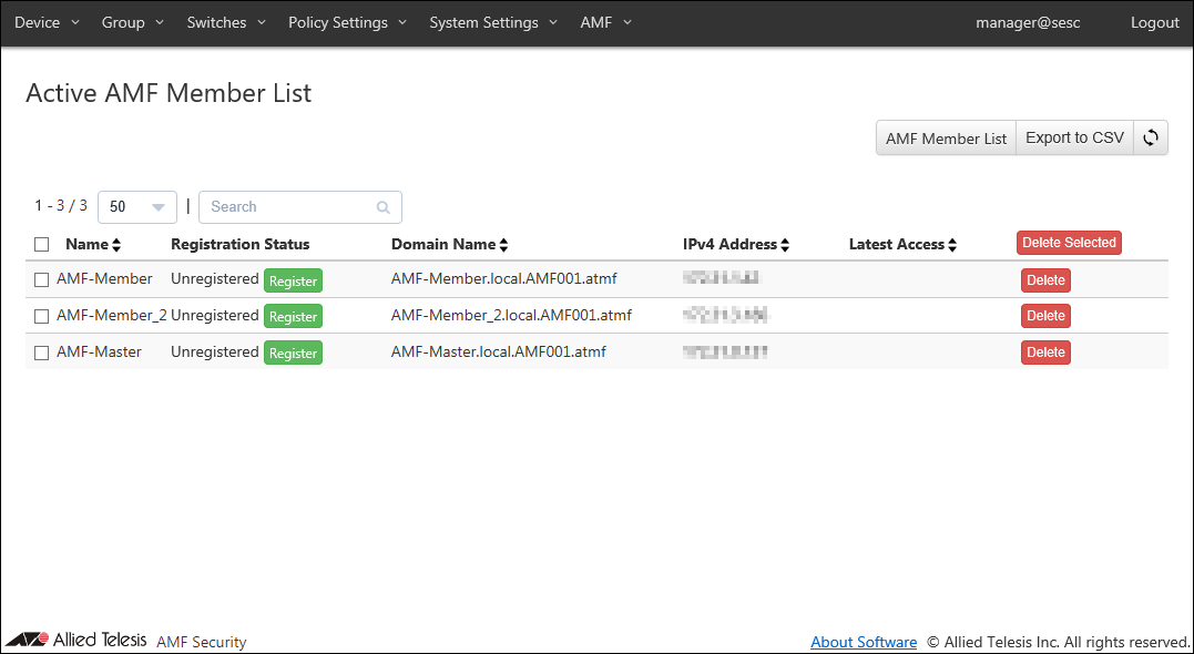 1. Open the Switches > Active AMF Member List page.