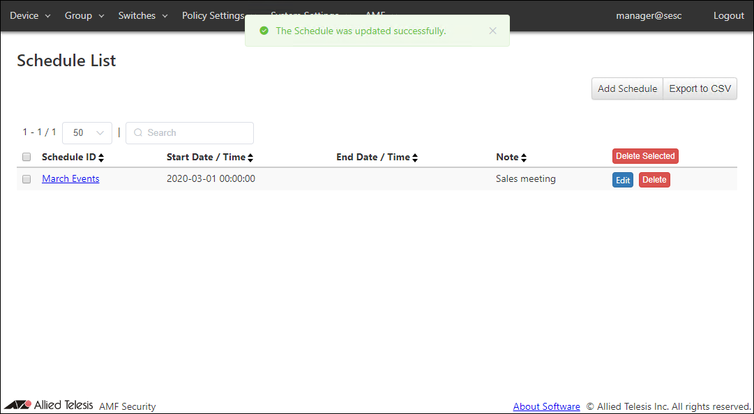 This page lists registered schedules in AMF Security. As you see, there is no schedule at this point.