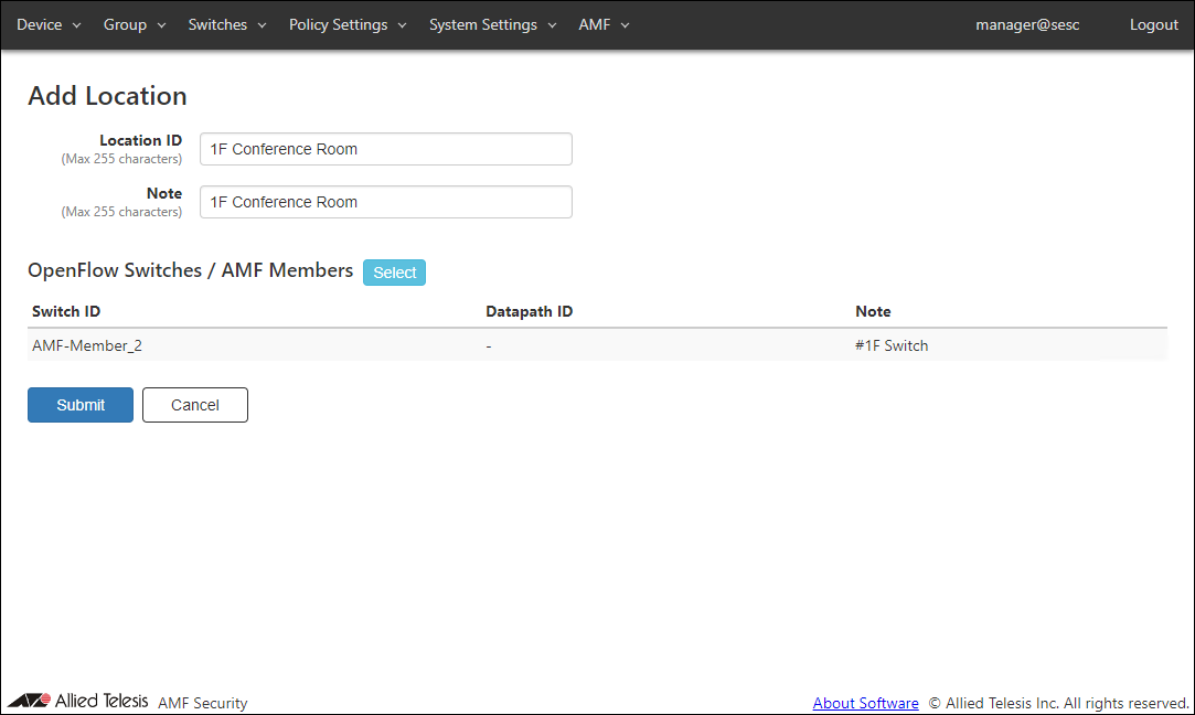 Add a new location where the OpenFlow Switch and the AMF Member are installed.