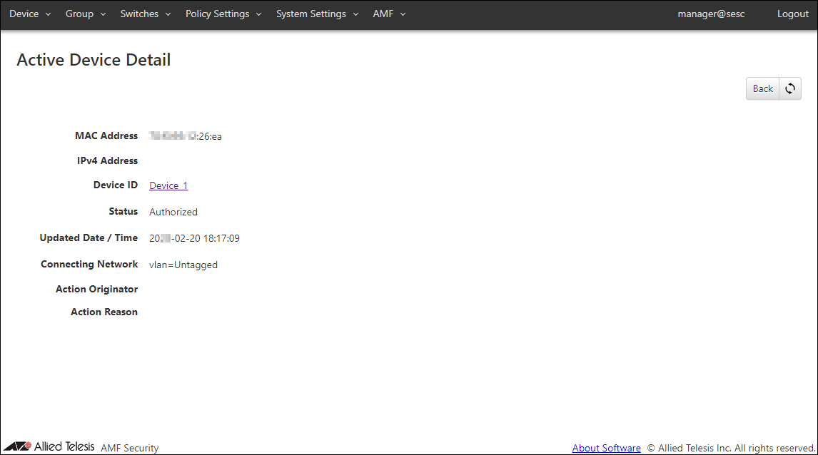 | MAC Address | MAC address managed by AMF Security. When the device is blocked by an IP address, the IP address is also displayed. When you click the MAC or IP address, the Active Device Detail page for the device is displayed. |
