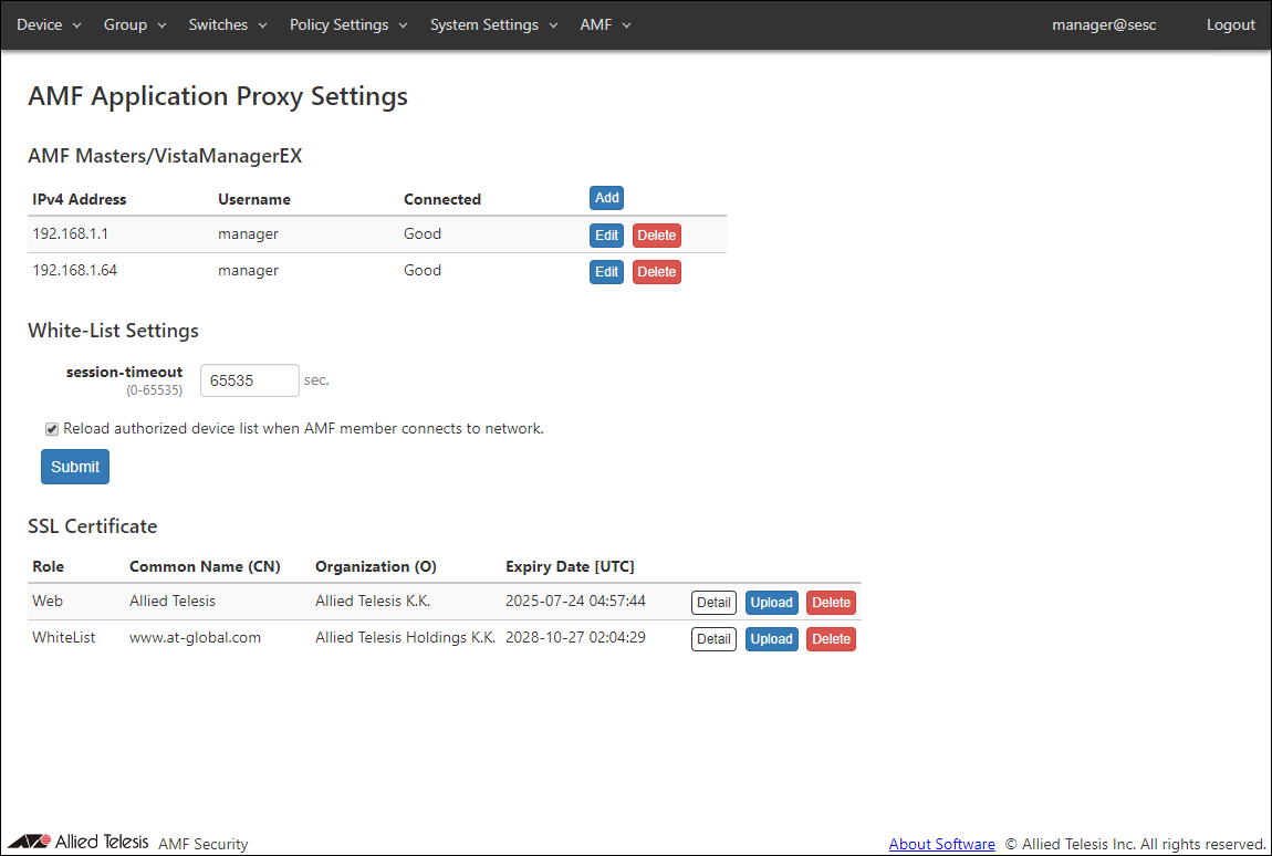 Register the AMF Master in AMF Security. It also shows a list of registered AMF Masters.NoteAT-Vista Manager EX is not supported and should not be registered.