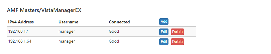 | Add | Open Update AMF Master/VistaManagerEX dialog to register a new AMF Master. |