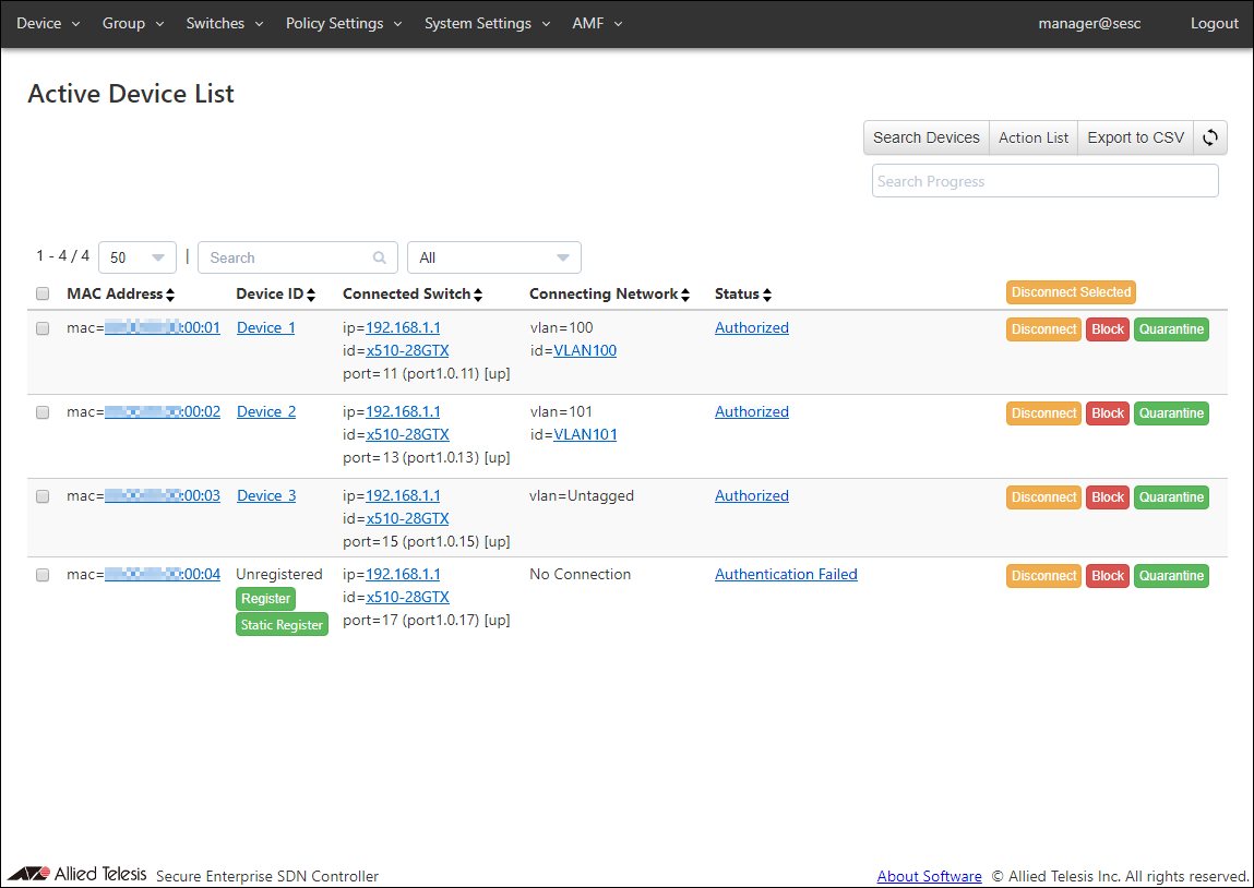 AMF Security authenticates devices connected to the OpenFlow Switch using the registered authentication data.