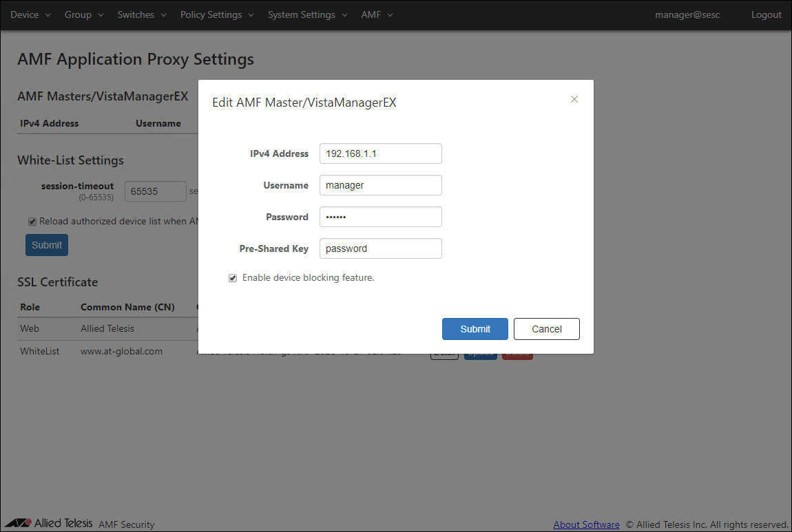 Enter the AMF Master's IP address, username, password and pre-shared key, check all boxes and click "Submit".