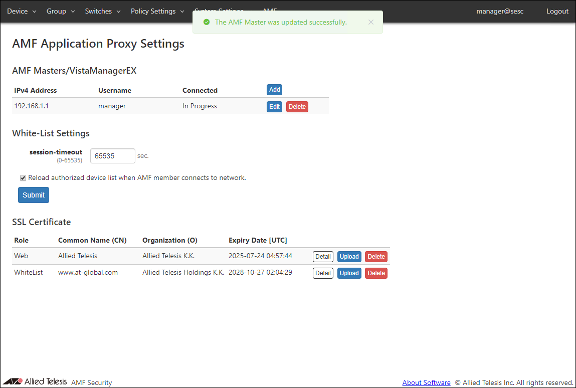You can view the registered AMF Master on the AMF > AMF Application Proxy Settings page.