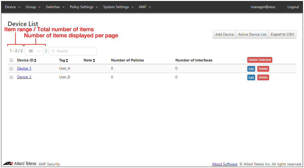 On the Device > Active Device List page and the Switches > Active OpenFlow Switch List page, you can filter items by the status of Devices or OpenFlow Switches using dropdown menu.