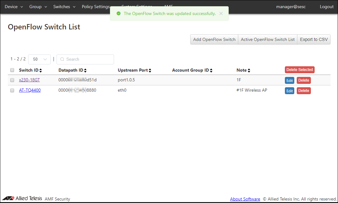 Let's register an AT-TQ4400 as an OpenFlow Switch.- Open the Switches > Active OpenFlow Switch List page.