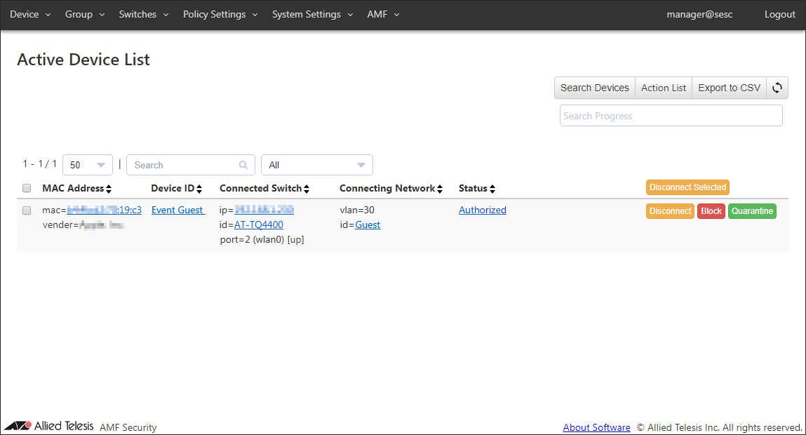 As a sequel to the previous section Manually Adding Devices > Registering OpenFlow Switch, this is an example of adding a wireless access point "AT-TQ4400" as an OpenFlow Switch and "AMF-Member_2" as an AMF Member, and providing a Guest Network to devices connected via this OpenFlow Switch during a predetermined period.Registering OpenFlow Switch