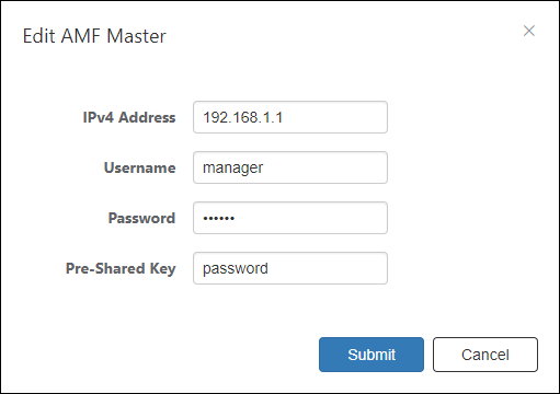 Enter the AMF Master's IP address, username, password and pre-shared key, check all boxes and click "Submit".