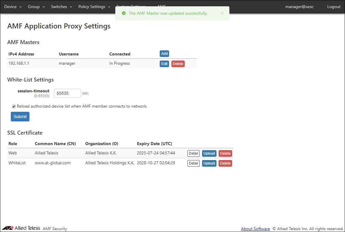 You can view the registered AMF Master on the AMF > AMF Application Proxy Settings page.