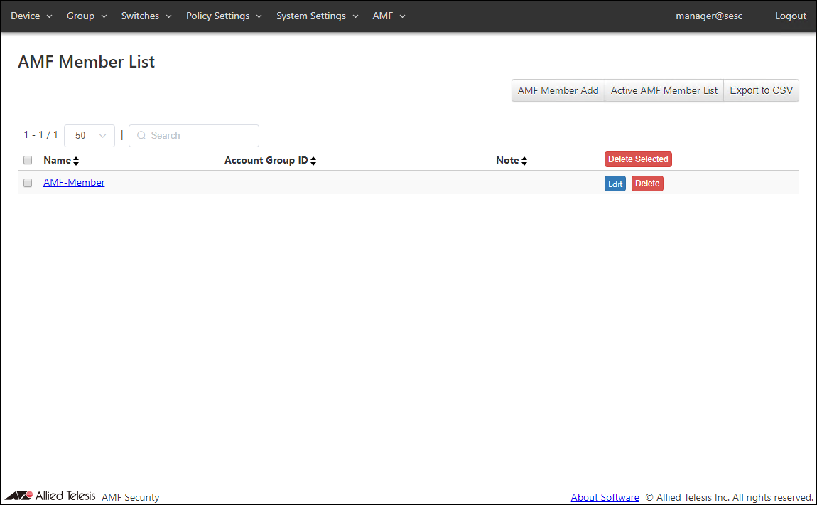 Once the connection between AMF Security and the AMF Master is established, connected AMF nodes are displayed on the Switches > Active AMF Member List page.