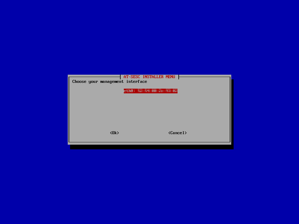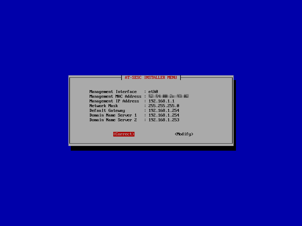 The AMF Security Installation Media does not support UEFI boot. Make sure that the server is using the legacy BIOS for system startup. - On the following screen, select "Install AT-SESC" and press Enter.