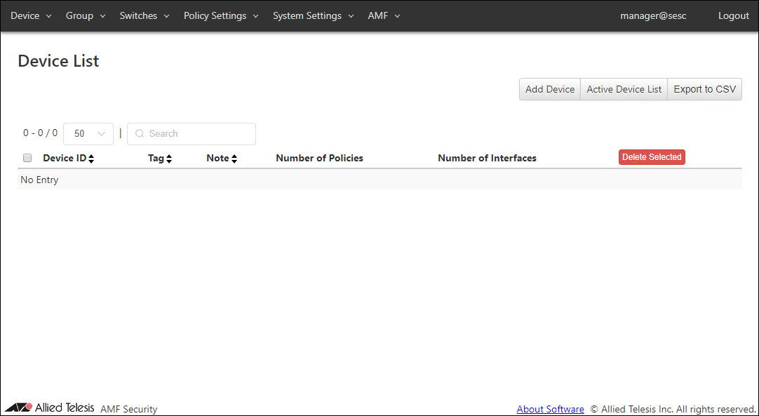 This page lists registered devices in AMF Security. As you see, no device is registered at this point.