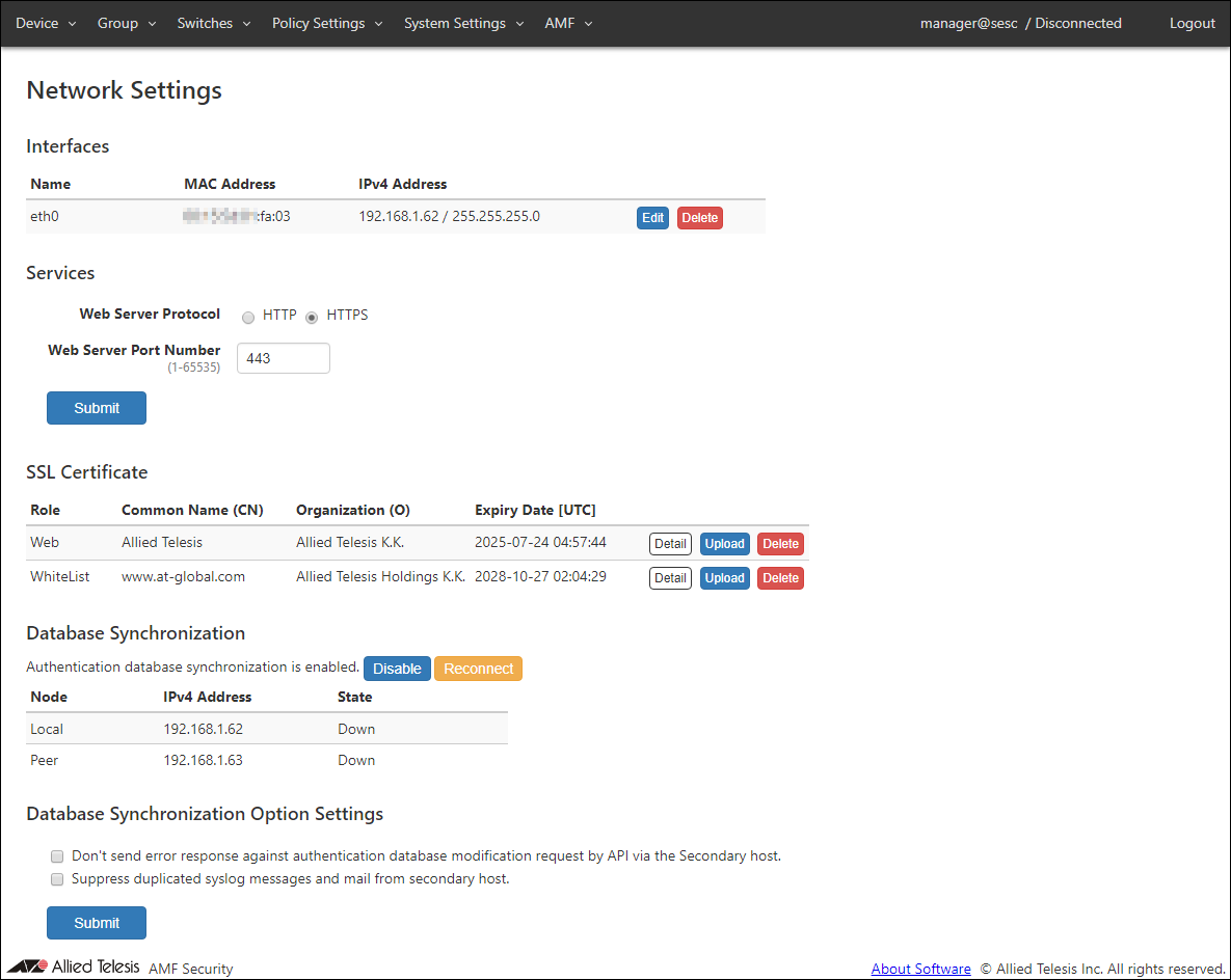 - Open the System Settings > Network Settingspage on AMF Security where "Local" in the "Database Sync" item is displayed as "Down".