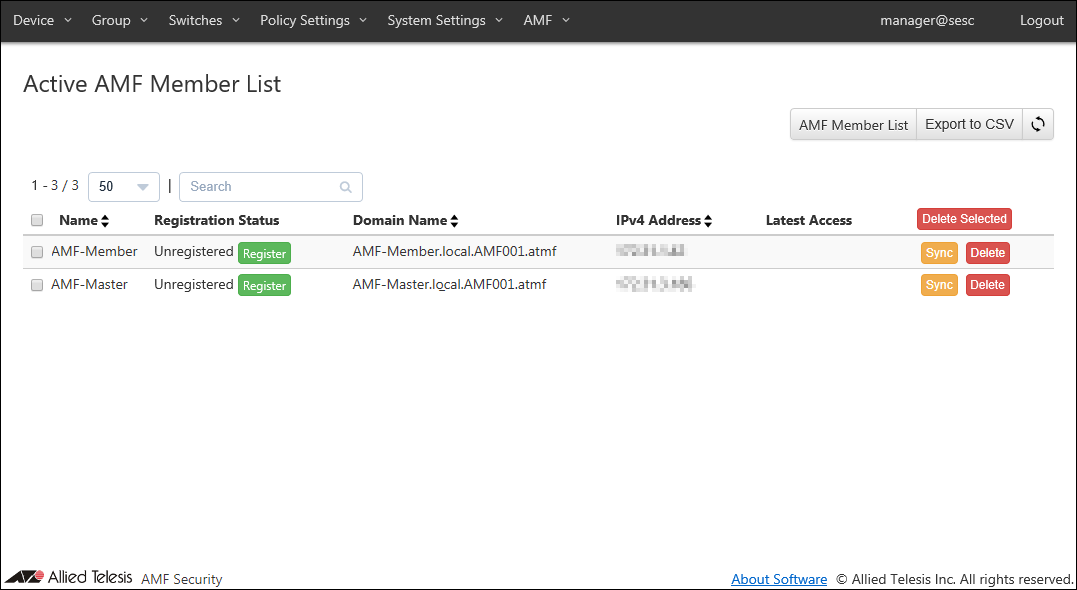 Once the connection between AMF Security and the AMF Master is established, connected AMF nodes are displayed on the Switches > Active AMF Member List page.