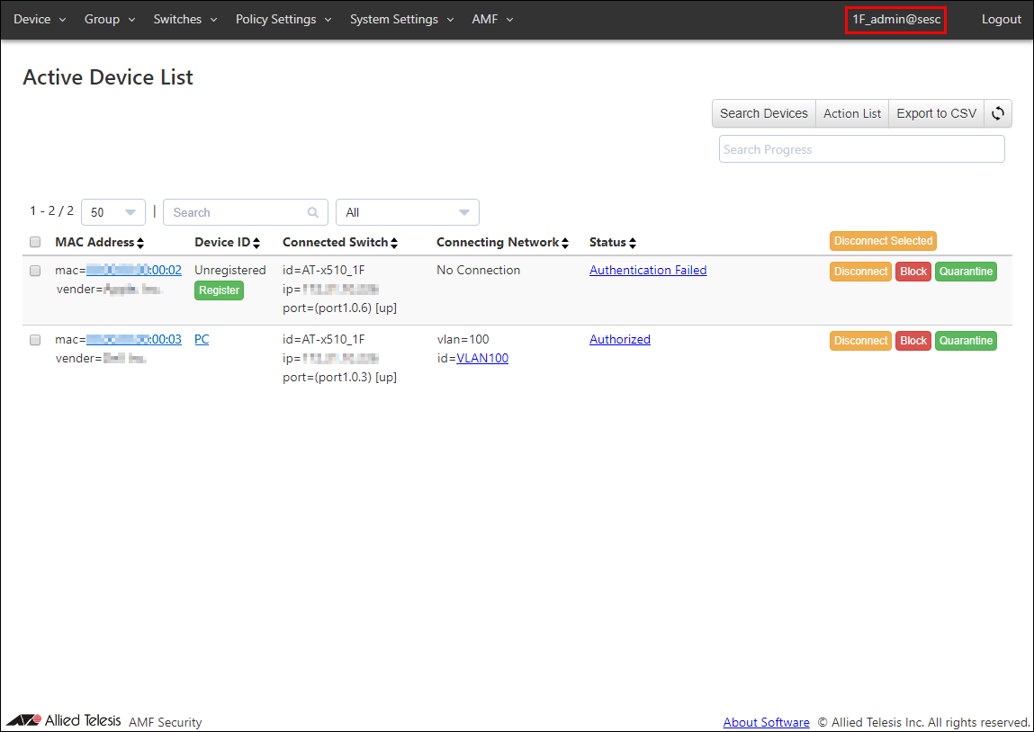 Account Group associates Accounts and Switches (OpenFlow Switches and AMF Members).In the page below, only Switches that have the same Account Group as the Account Group set for the logged-in Account and devices connected to the Switch are displayed.