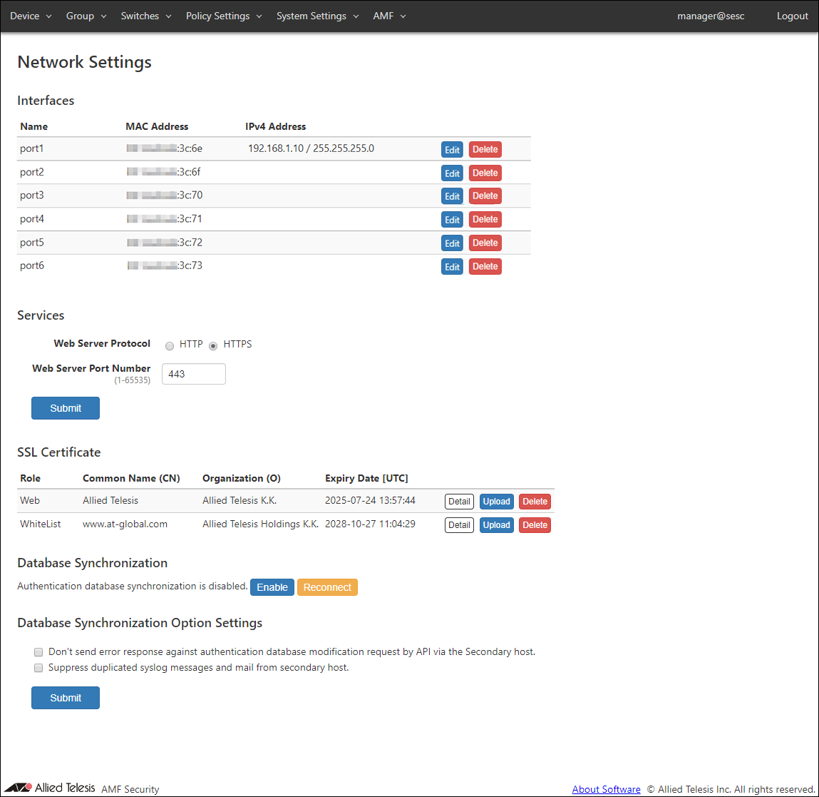 NoteIf you upgrade to this version with the web server protocol and port number set to HTTPS / 80 in AT-SESC software version 1.8.x, or if you import the system setting file with the same settings, It will be changed to HTTP / 80 settings.