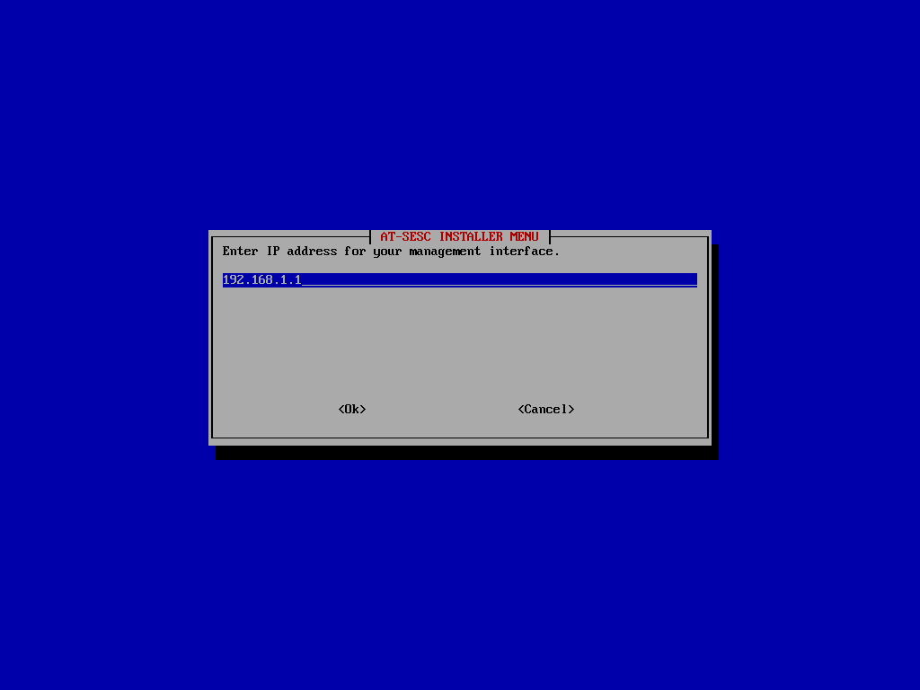 The AMF Security Installation Media does not support UEFI boot. Make sure that the server is using the legacy BIOS for system startup. - On the following screen, select "Install AT-SESC" and press Enter.