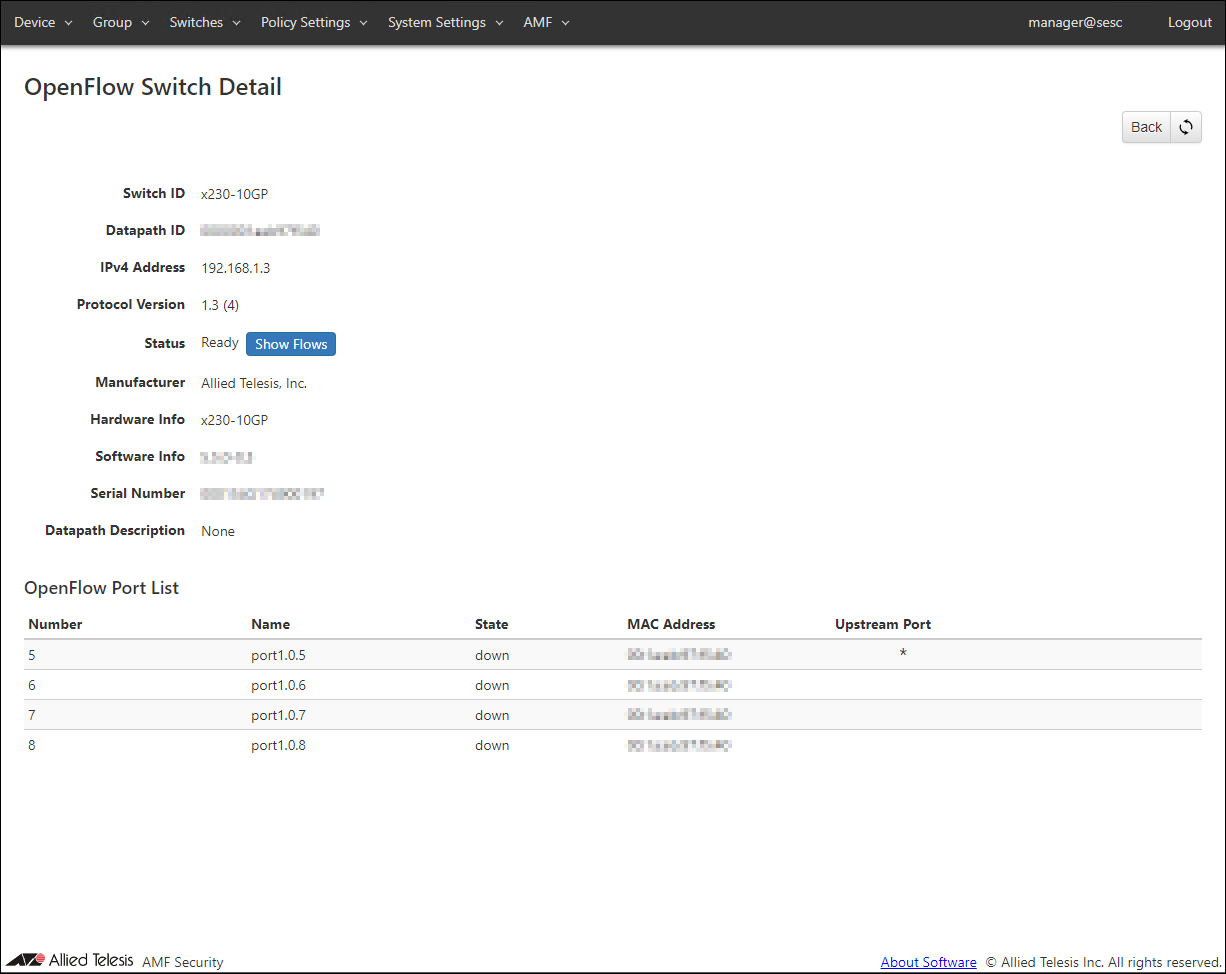 NoteName of the upstream ports may vary depending on the model of the OpenFlow Switches.Datapath ID of an OpenFlow Switch cannot be changed from AMF Security.