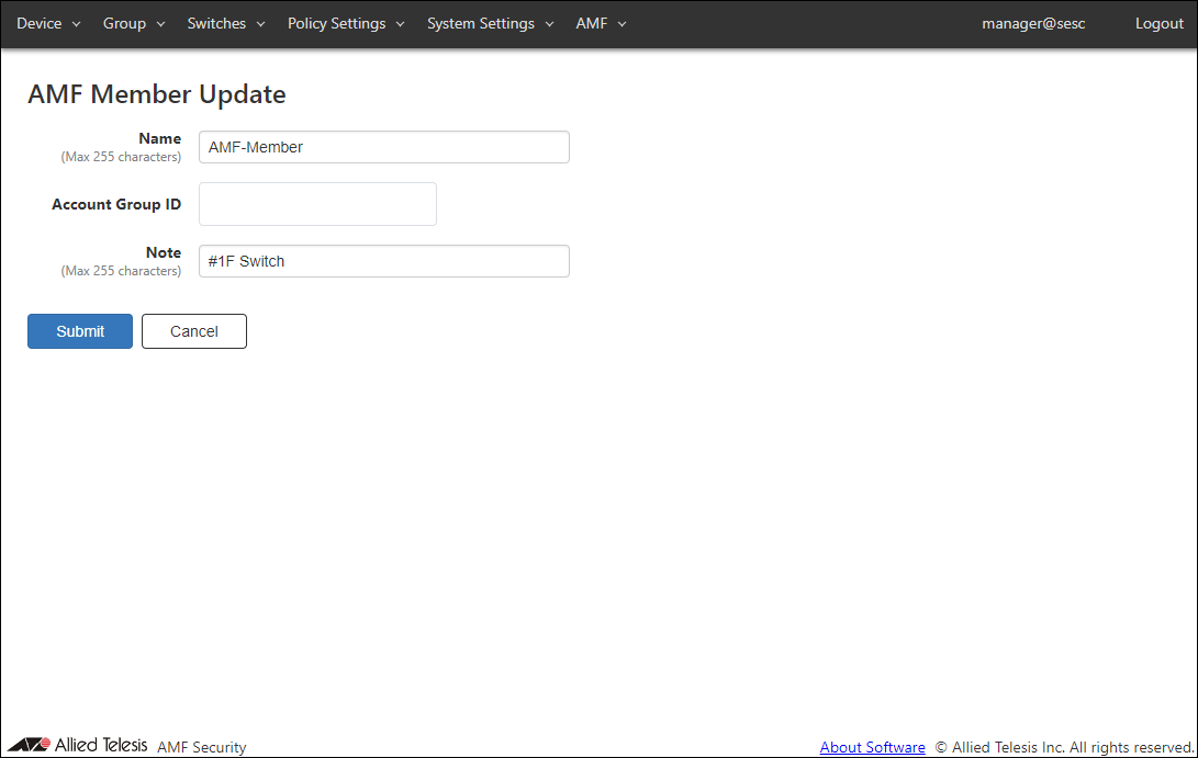 | Name | Name of the AMF Member. Switch ID and Name that are already used cannot be set on the OpenFlow Switch List page and the AMF Member List page. Max 255 characters. Can use alphanumeric, hyphen (-) and underscore (_). |