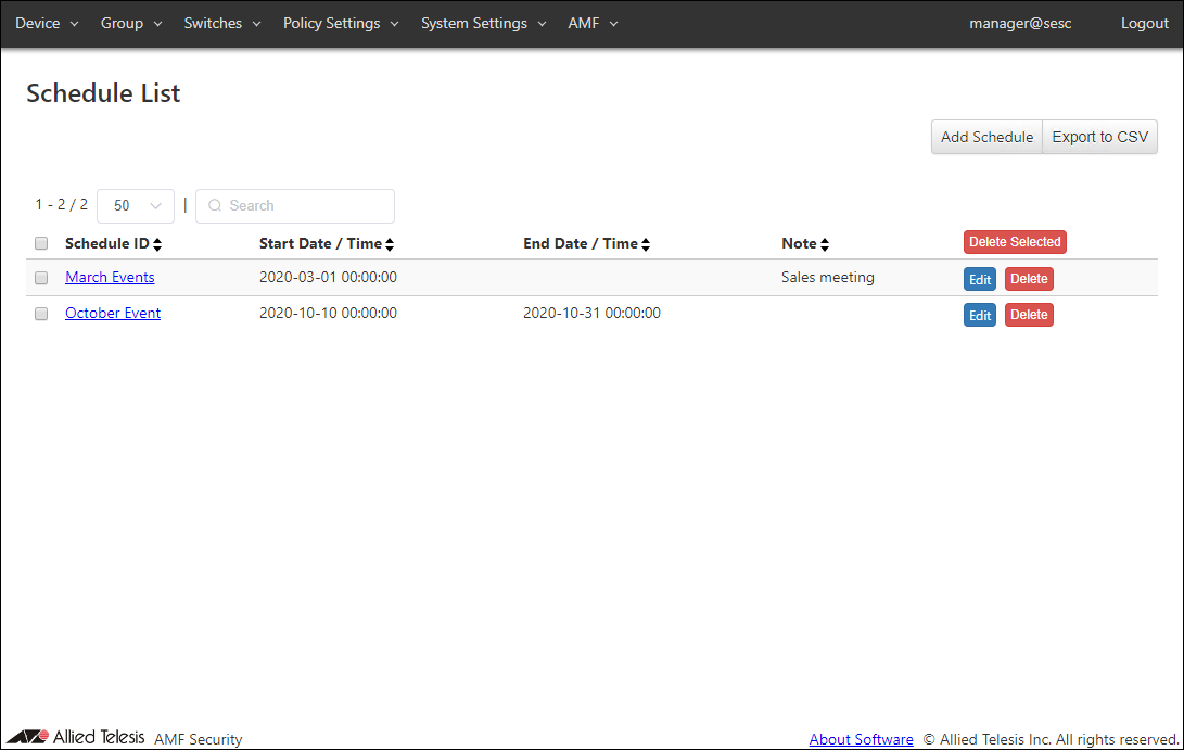 This page shows a list of Schedules.NoteThe Start Date / Time and End Date / Time to be set are the date and time of the timezone currently set on the System Settings /Date > Time Settings page.